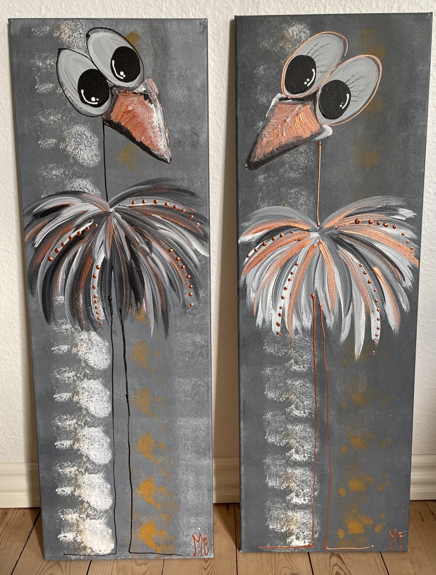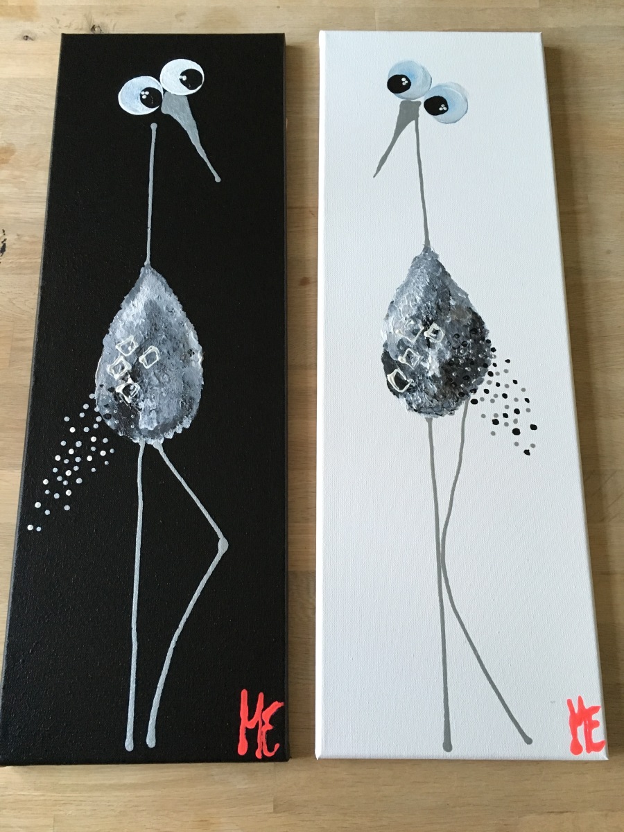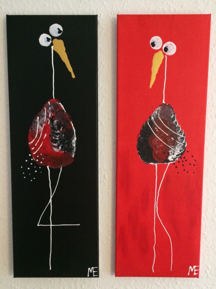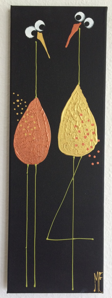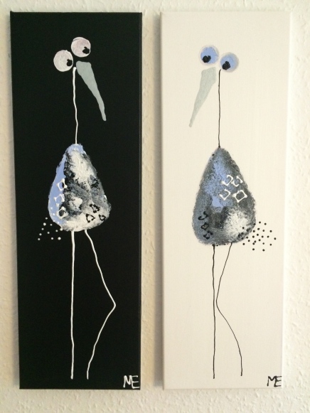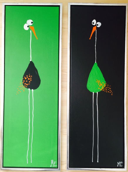 Et meget lækkert billede. De kan hænge som et par eller enkeltvis. Det slanke mål på lærredet (her 30x90) komplimenterer fuglenes lange ben og hals og giver et elegant og roligt billede.