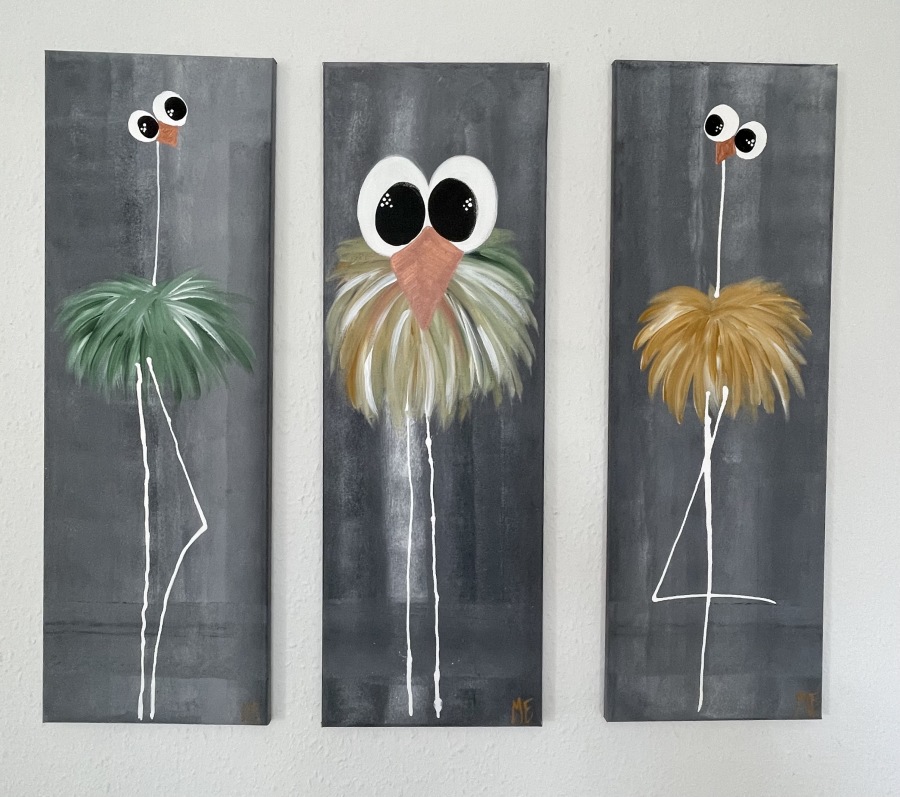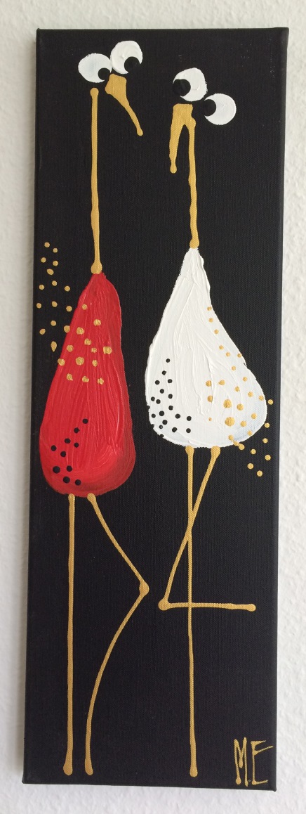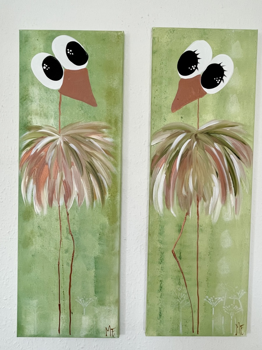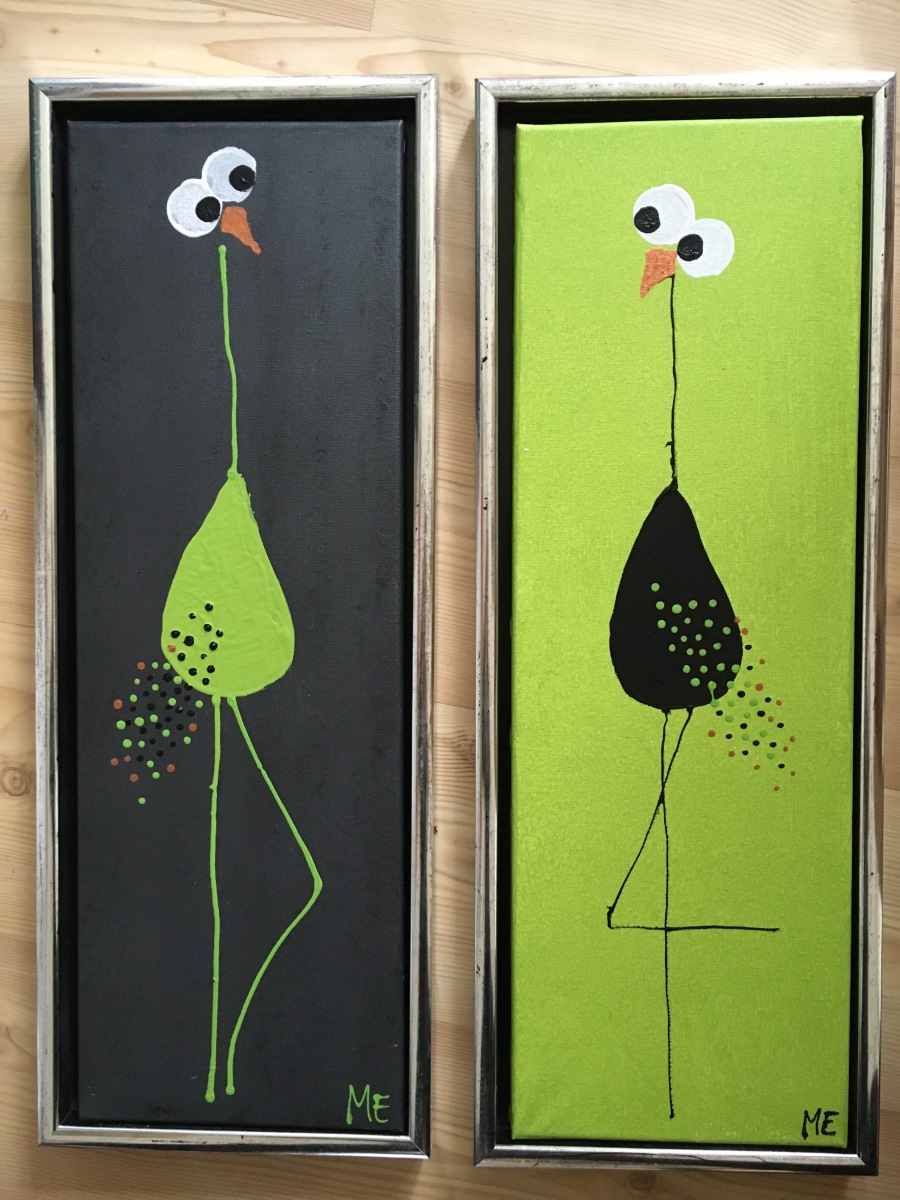 Et meget lækkert billede. De kan hænge som et par eller enkeltvis. Det slanke mål på lærredet (her 30x90) komplimenterer fuglenes lange ben og hals og giver et elegant og roligt billede.