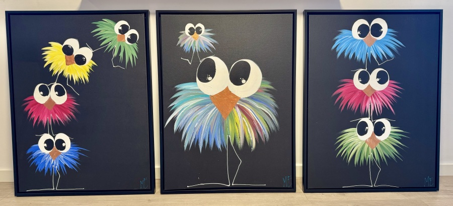 Nr. 211 3 super fine malerier i klare farver med sjove motiver 60X80 cm pr stk